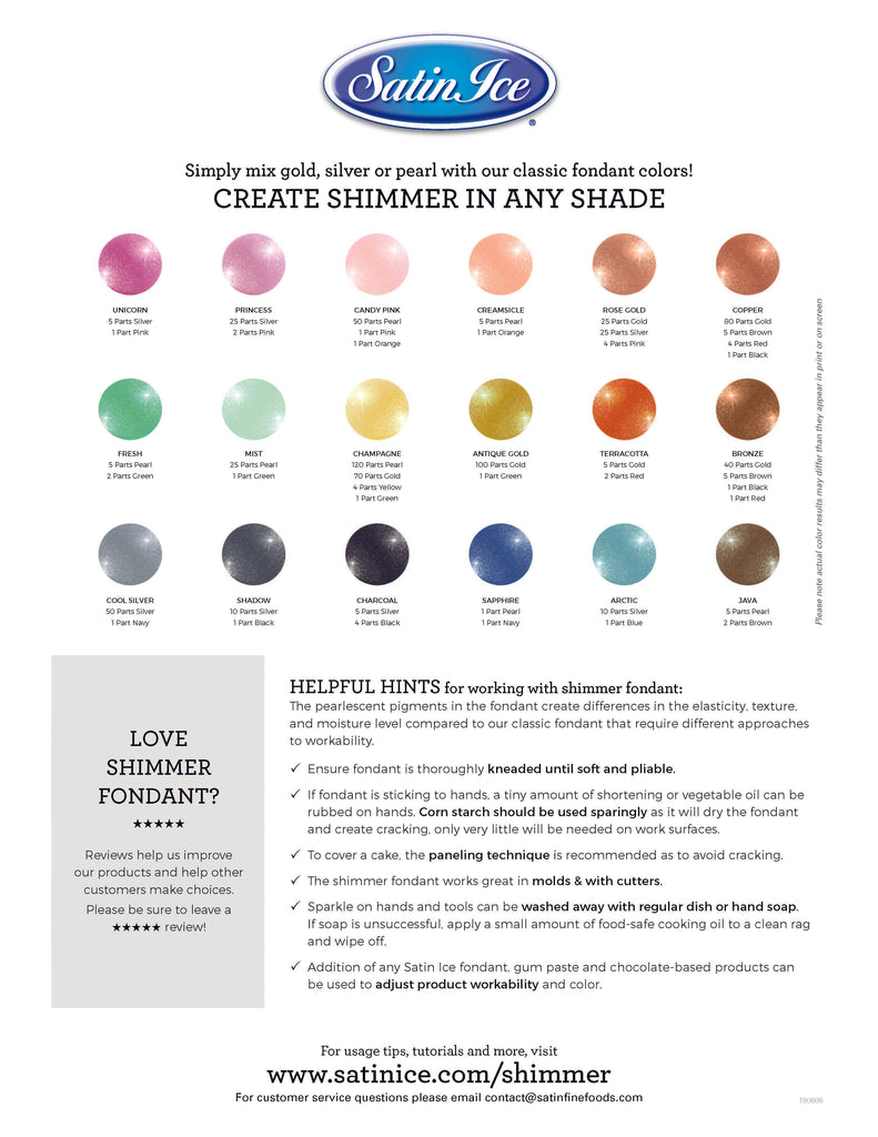 The Satin Ice Shimmer Collection is premixed with ultra-fine edible glitter to give your fondant work a touch of elegance without the extra time and materials. Satin Ice is a premium quality fondant for creating a smooth, elegant finish for cakes, cookies, cupcakes, and more. Additionally, it is used as a modeling paste to create decorative embellishments.